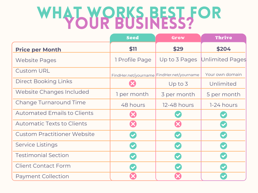 A simple place to begin sharing your gifts. Perfect for practitioners who are just starting their journey and want a professional online presence without the stress of building a website. Your Find Her page allows potential clients to learn about your work, understand the services you offer, and easily reach out to begin the booking process. Best For: Practitioners who are actively working with clients and want a streamlined system for bookings and communication.